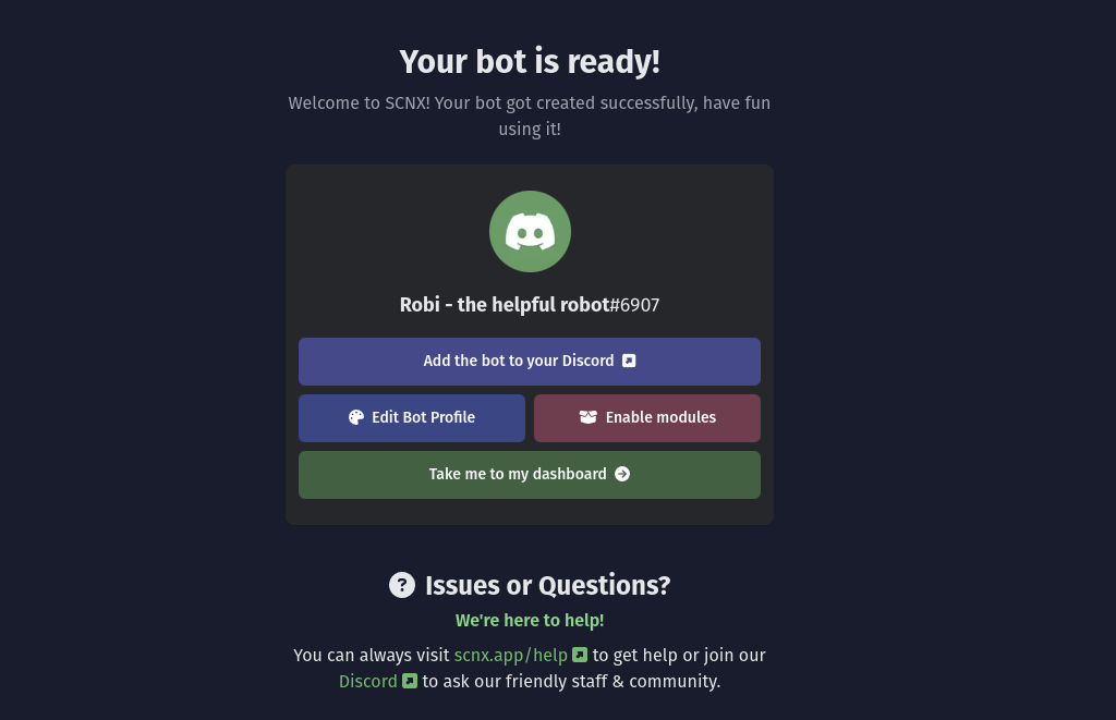 Once this is done, your bot is fully ready to use SCNX. Return to the setup flow to edit the bot profile with the "Edit profile" button (you can also do this later), enable modules or explore all features your bot.